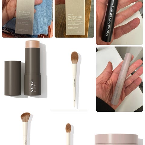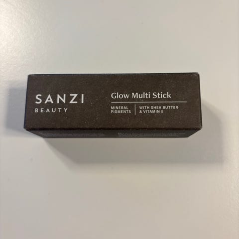 Sanzi Beauty Glow Multi Stick med ingredienser som sheasmør og vitamin E. Produktet er designet til at give en glødende effekt og kan anvendes på flere områder af ansigtet.