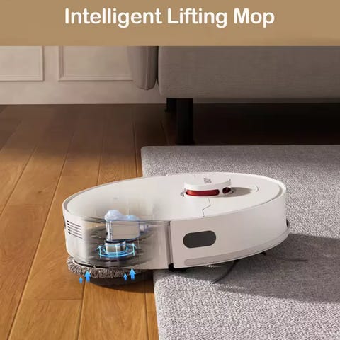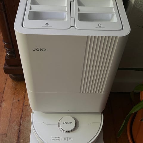 Jona robotstøvsuger med tilhørende ladestation. Enheden er designet til automatiseret gulvrengøring og oplades ved ladestationen.