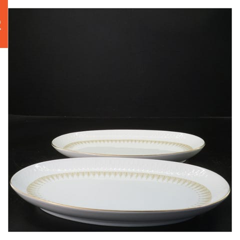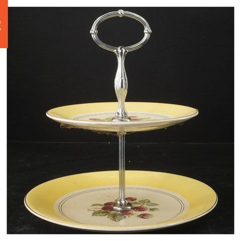 Dette er et to-etagers serveringsfad med en diameter på 25 cm. Fadet er fremstillet i hvidt porcelæn og har en central metalstang med et håndtag i toppen for nem transport. Det øverste fad er mindre end det nederste fad, som giver mulighed for at servere forskellige typer mad samtidig.