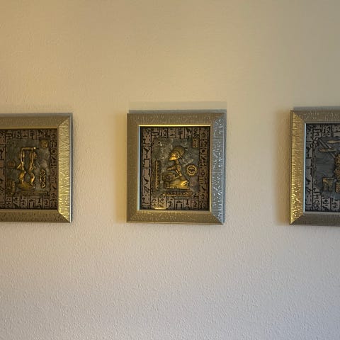 Seks billeder. 15 x 15 cm. 150 kr. pr. sæt a 3 stk. Ingen ophængningsbeslag, men kan nemt hænges op med elefantsnot, klæbe gummi, nano gel tape eller lignende. Kan sendes med Postnord