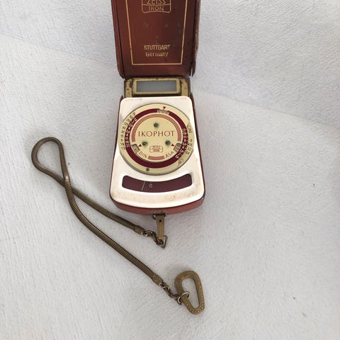 Vintage lysmåler i læderetui. Meget sjælden, Tower, Belysningsmåler, sort og hvid plastik. Åbnes vha en "jalousi låge" fortil. Mærket "Tower". Fremstillet i Vesttyskland og købt i USA i 1950'erne. Selve måler og etui hænger sammen ved en bøjelig metal kæde.