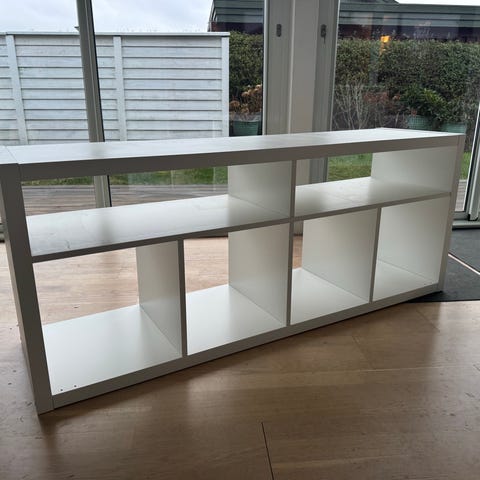 Kallax reol med 4 rum - kan bruges stående eller liggende. Evt. som TV-bord.