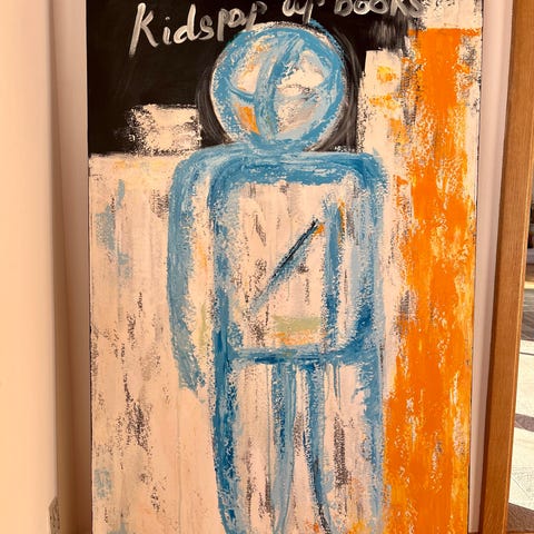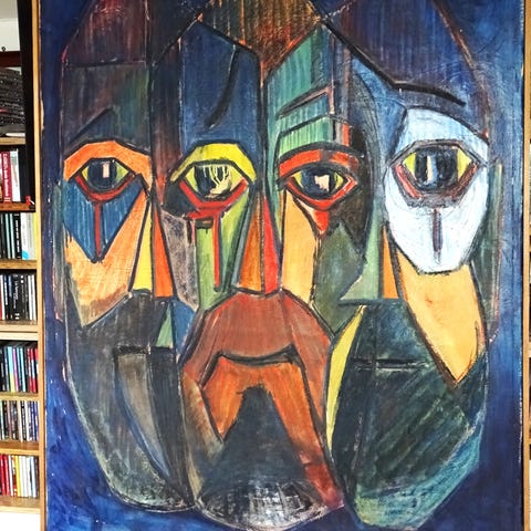 Olie maleri af en mand med kort hår, ørering og ring på fingeren. Maleriet viser en nærbillede af mandens ansigt og hånd i varme farver med fokus på detaljer i ansigtstræk og smykker.