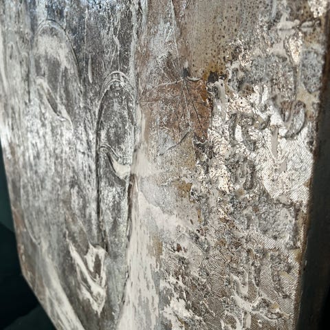 Maleri af Buddha ansigt med lukkede øjne, udført i mørke og guldtoner. Kunstværket har en firkantet form og viser detaljerede ansigtstræk med fokus på ro og meditation.