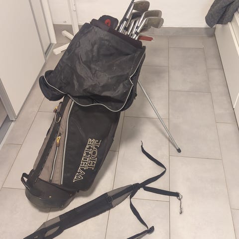 Golfudstyr med tilhørende golfbag i sort og rød farve. Sættet indeholder flere golfkøller af forskellige typer og størrelser. Golfbaggene har flere lommer til opbevaring af golfbolde og tilbehør. Materialet på golfudstyret og bagene fremstår som slidstærkt og egnet til udendørs brug.