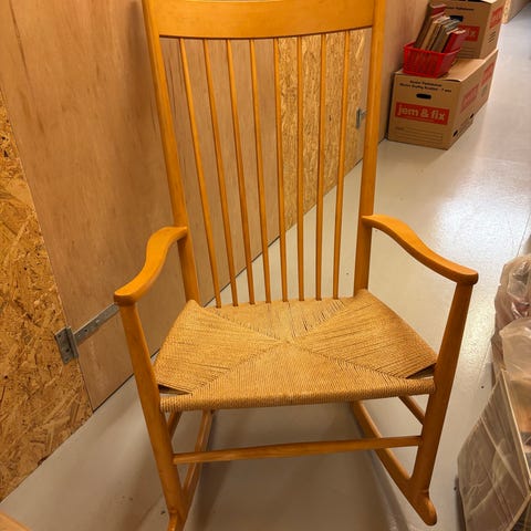 J16 Wegner gyngestol, ubehandlet bøg, naturflet. Fremstår meget pæn og velholdt og naturflet uden pletter og helt 100% intakt. Stolen er aldrig renoveret og står helt original. Der medfølger sædehynde og nakkepude i sort læder. Fra røg- og dyrefrit hjem.