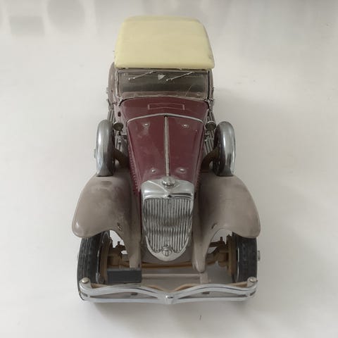 Legetøjsbil i rød farve med cremefarvet interiør. Modellen er vintage og har detaljer som forlygter og kølergrill. Bilen har åbent tag og siddepladser indvendigt.
