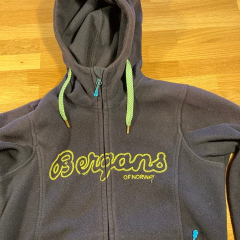 Superfin og varm fleecetrøje/jakke fra Bergans i str 128. Jakken er lavet i et blødt, komfortabelt fleece-materiale med fast hætte, to lommer og elastiske ærmeafslutninger. I meget pæn stand. Fra røg- og dyrefrit hjem.