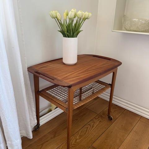 Det originale bakkebord i teak designet af Svend Willumsen og H. Engholm for Fritz Hansen i 1958.