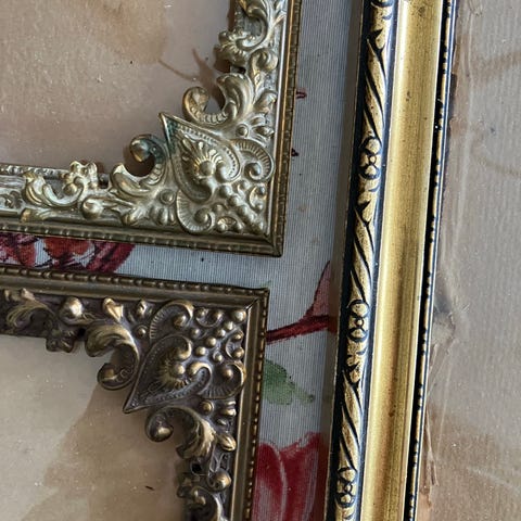 Gamle billeder i gamle rammer, forgyldte rammer, trærammer. Broderier, tryk, farvede tryk, tegninger, maleri.