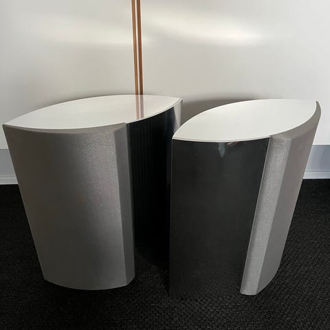 Bang & Olufsen højttalere sæt med sort og aluminium. Designet med buede metalbagsider og sort stof foran.