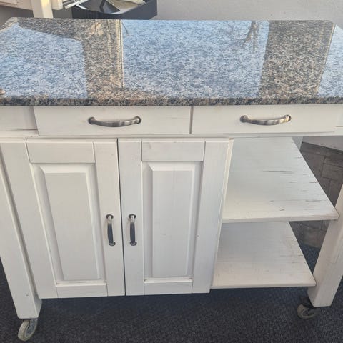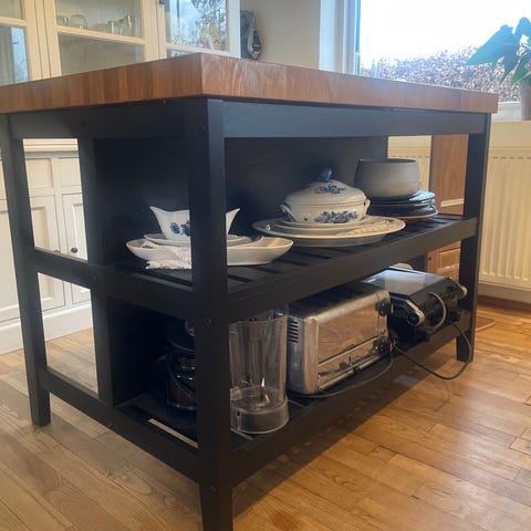 Rullebord med træbordplade og metalramme. Indeholder to hylder til opbevaring af køkkengrej og tilbehør. Udstyret med hjul for nem flytning. Velegnet til brug i køkken eller opbevaringsrum.