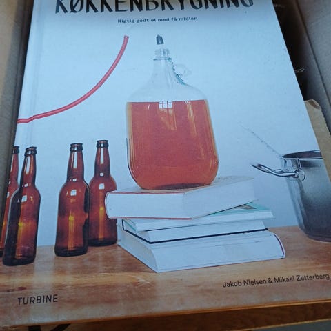 Sæt bestående af 60 flasker 33 cl. m/ prop, boiler 30 ltr,, 2 stk 20 ltr plasticspande, div. siliconeslanger, 20 ltr spand med aftapningshane, stålchiller, 10 ltr Cornelius fustage, 6 div. 5 ltr fustager.