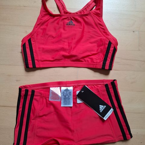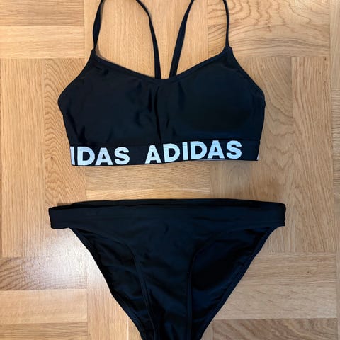 Badetøj, Bikini, Adidas, str. Medium, Stribet, Næsten som ny, Lækker Adidas bikini, stribet grå/sort/hvid/gul. Der er lidt fyld i trekant bh'en. Brugt 1 gang.