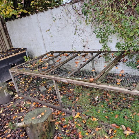 Læskur med siddepinde til mine høns som beskyttelse for vind, regn og rovfugle!