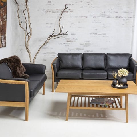 Pris for sættet med Denver læder, B6 hynder samt naturolieret egetræ: 25495 kr.