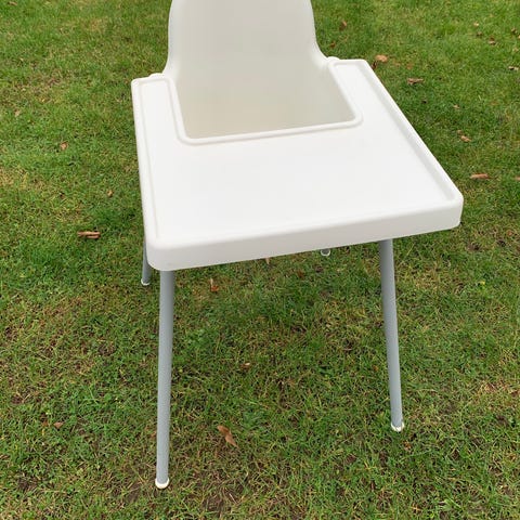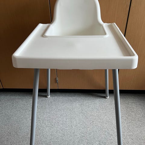 Hoppekids højstol med hvidt plastiksæde og naturlige træben. Højstolen er designet til børn og har en fodstøtte i træ. Egnet til brug ved spisebordet for små børn.
