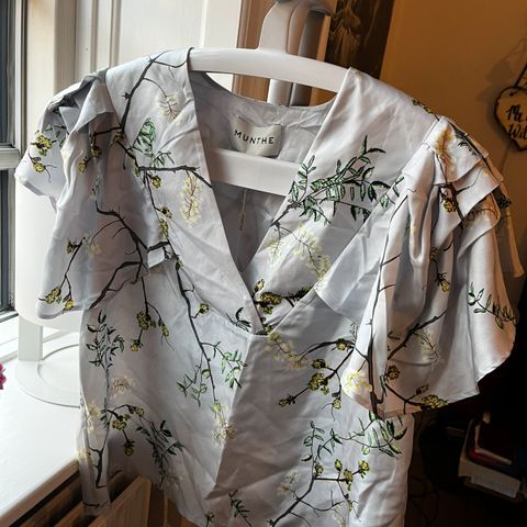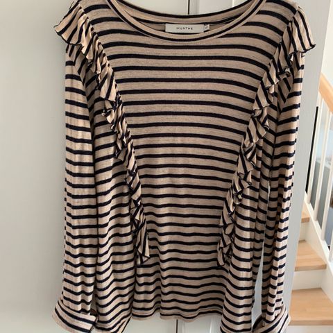 Munthe bluse til kvinder i størrelse 34. Strikken er beige og lavet af merinould. Den har en rund halsudskæring og lange ærmer. Materialet gør den velegnet til køligere vejr.