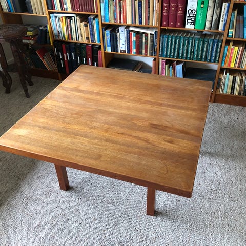 Sofabord i teaktræ fra med hylde i bambusflet og trekantet ben. Fremstår med et manglende bambusflet i et mindre område og brugsspor på toppladen.