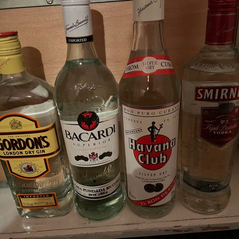 Der er 2 flasker Storck vodka, 2 flasker med bobler, en flaske Gordons Gin og noget Lime mixer. Alle uåbnede.