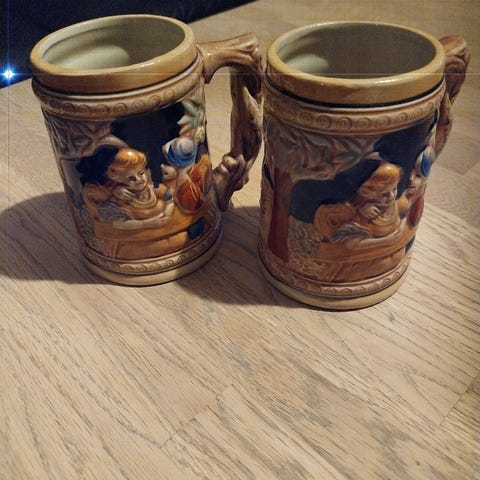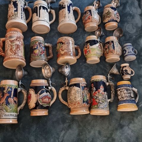 Beer Stein cat. no. 1068, Diana af Johann Peter Thewalt. Kruset er antikt og dekoreret med græske motiver i blå/grå glasur. Del af en serie af ølkrus, desværre mangler en stor del af dem låget af tin. Dette er også tilfældet her. Selve kruset er dog komplet ubeskadiget.