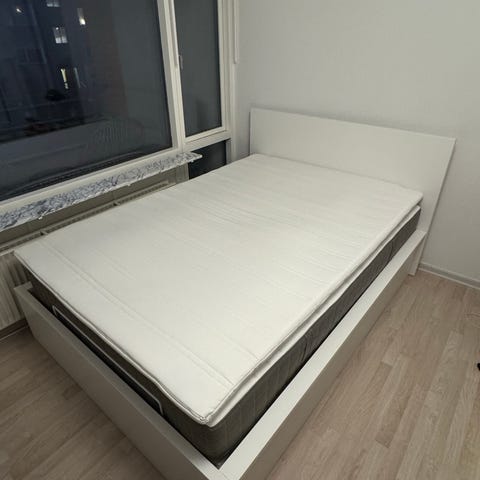Sælger MALM IKEA seng med tilhørende madras og topmadras. Sengen er meget praktisk, da der er god opbevaringsplads under madrasserne. Selve stellet måler 210x155 cm og madrasserne har målene 200X140 cm.