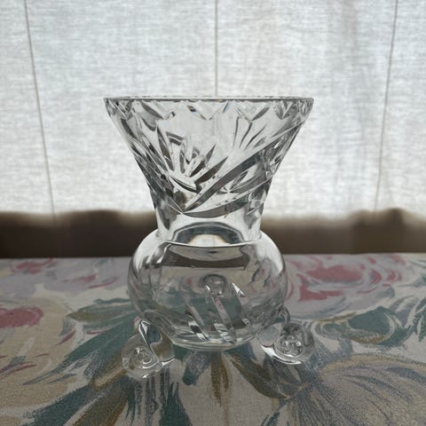 Glasvase i klar glas med mønster. Vase har en rund form med detaljeret overflade og er egnet til dekoration eller opbevaring af blomster.