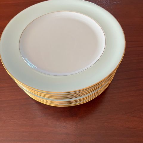 12 stks smukke Royal Copenhagen # 631 tallerken med orange/rød kant. Tallerkenen har en hvid midte og en bred orange/ rød kant med en guldkant yderst. Fremstillet i porcelæn.