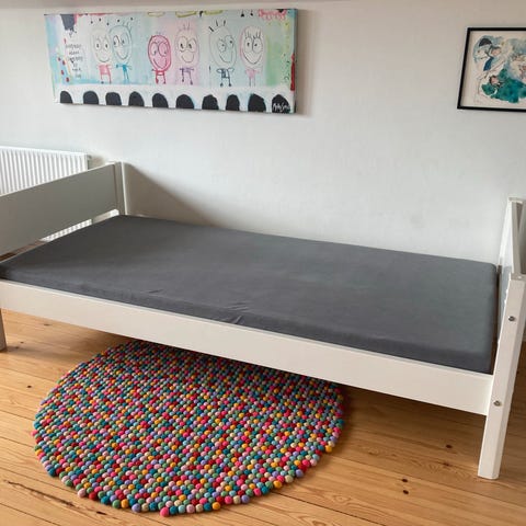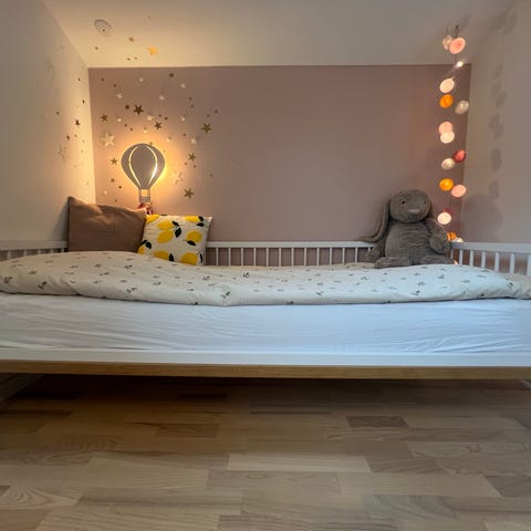 Min datter vil gerne have en større seng, så hermed sælges en flot og smart seng. Den er 90x200, kommer med 2 skuffer på den ene side, samt LED lys i gavlen, hvor man kan ændre på lys og farverne på fjernbetjeningen. Der medfølger madrassen på billedet, hvis dette ønskes.