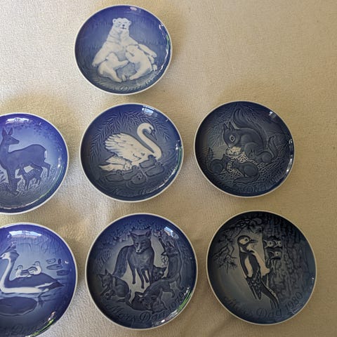 Bing & Grøndahl Mors Dag samling bestående af porcelænstallerkener med motiver af bla. svane med unger , hunde, katte, hest og føl samt ræve. Tallerkenerne er blå-hvide og dekorative, egnet til samling eller udstilling.