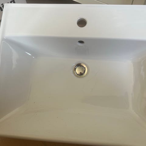 Hans Grohe håndvask + underskab sælges. Nypris 4.172 kr. Har kun været kortvarigt monteret. Sælges grundet hul i underskab (se billeder), lavet i forbindelse med montering. OBS. der mangler skruer til montering af håndvask og underskab.