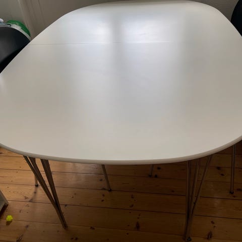 Spisebord i hvidt med oval form, ledsaget af fire matchende højryggede stole. Bordet og stolene er i kirsebærtræ og professionelt lakeret i højglans hvid. Bordet har udtræk med indbygget plade på 45cm bred, så bordet kan blive 195 cm langt.