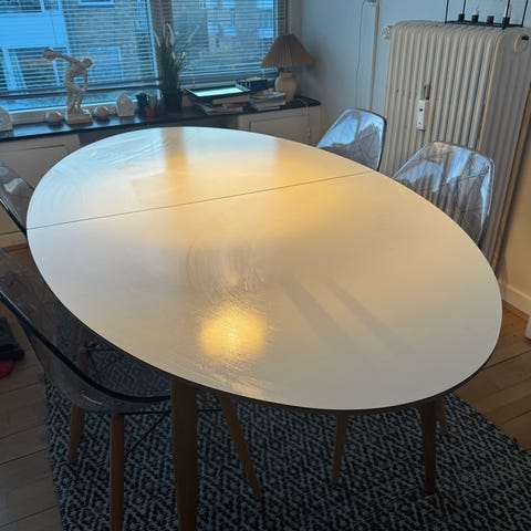Hvidt ovalt spisebord med 6 stole