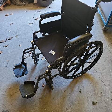 Standard kørestol med foldbar ramme i sort farve. Kørestolen har armlæn og store baghjul til manuel betjening. Velegnet til personer med behov for mobilitetshjælp. Kan nemt foldes sammen for transport og opbevaring.