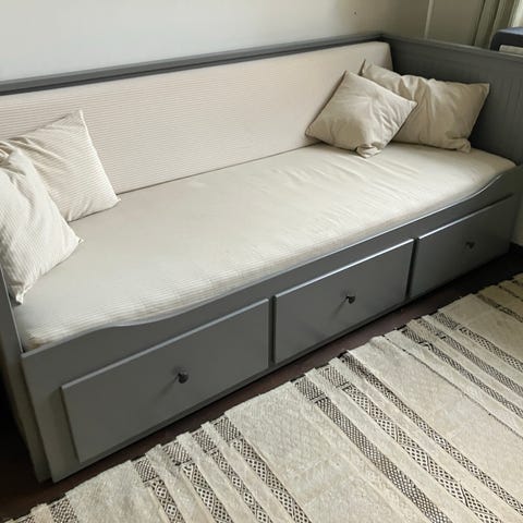 God og rummelig seng som kan bruges som enkelt el dobbelt seng med 3 skuffer til opbevaring flot hvid farve. Har dog 3 brædder som skal skiftes men det kan man få i byggemarkedet. Nypris 3650kr