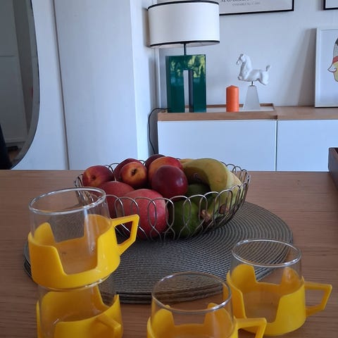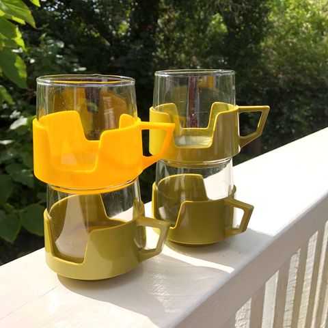 7 picnickopper fra engelske JAJ (James A Jobling) fra 70’erne. Jeg kalder dem spacekopper, men de hedder vist oprindelig “Drink Up”. Glassene er af Pyrex og kan tages ud af holderne, som er i stærk plastik. Nogle har stempler, andre ikke og de er ikke helt ens. Dia 6,5 cm. Lidt ridser på glas fra holderne.