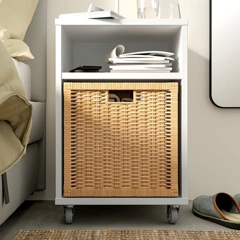 Et praktiskt og stabilt sengebord fra IKEA, - Resgods - som kan slåes sammen og opbevares under sengen. Det er både stabilt, når det er slået op eller når det bare ligger på sengen. Vist nok Bambus.