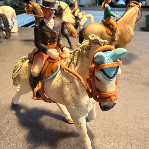 Legetøj bestående af en hvid hest med sadel og tøjret samt en rytter iført brun beklædning. Figuren er detaljeret med fokus på hestens man og rytterens positur. Egnet til samling eller leg.
