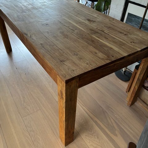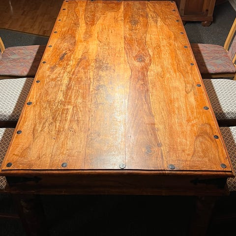 Ældre spisebord i hårdt træ med olivengrøn linoleum. 8-10 personer. Synlig cigaret mærke. Sælges uden stole - kun bord. Henvend dig, hvis du er interesseret.