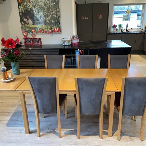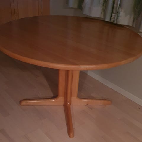 Pæn spisebord i bøg, der medfølger 2 stk tillægsplader, stole er ikke med, kan tilkøbes.