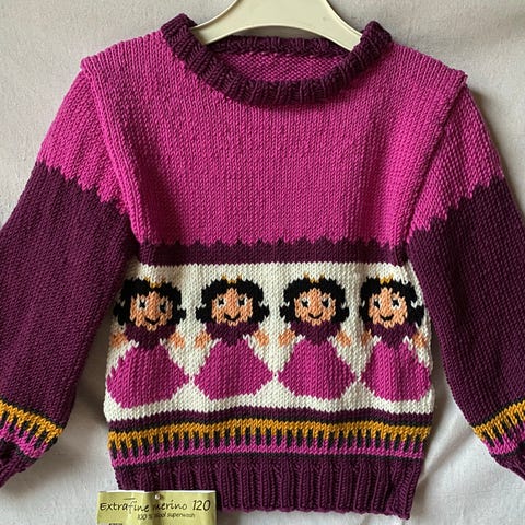Ny, håndstrikket trøje, i 100% uld. Passer til str. 8-9 år.