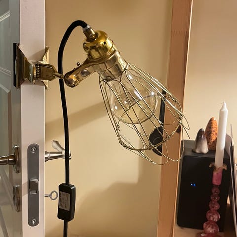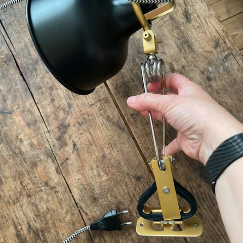 Der følger pære med til lampen, længde af hele lampen er ca 40 cm. Kan justeres. Der er afbryder på ledningen.