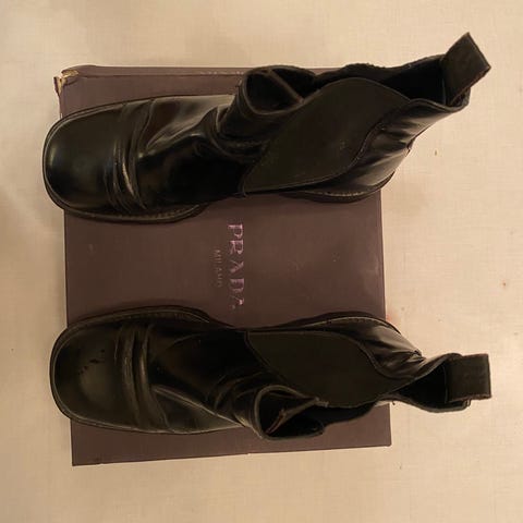 Prada støvler i størrelse 44 -45, lavet i brun ruskind. Støvlerne har snørelukning og en slidstærk gummisål. Der er ingen slid på skoen eller sålen. Kan prøves i Aarhus C