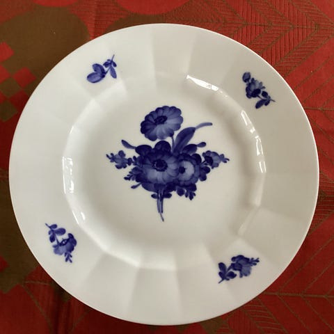 Royal Copenhagen tallerken med blå blomsterdekor. Tallerkenen har en unik form med ottekantet kant og blå blomsterprint på hvid porcelæn. Diameteren er ca. 27 cm. Velegnet til servering og dekoration.