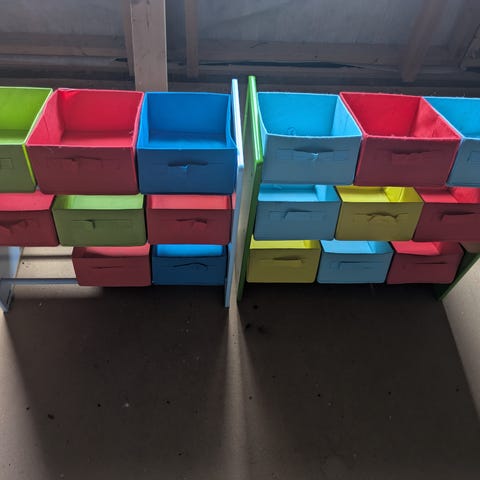 IKEA opbevaringsreol med farvede plastkasser