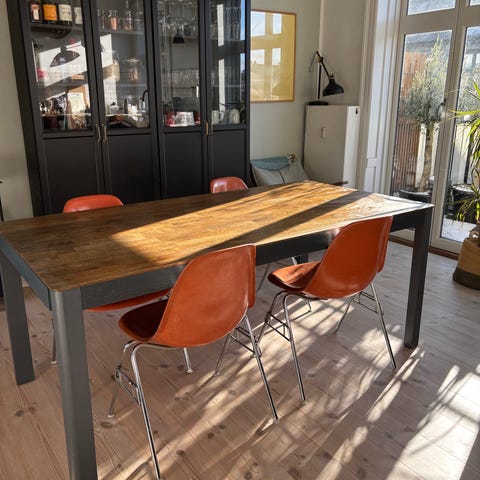 Der er spor, mærker og hvis det skal se helt nyt ud igen kunne det godt trænge til lidt sandpapir og ny bejse.