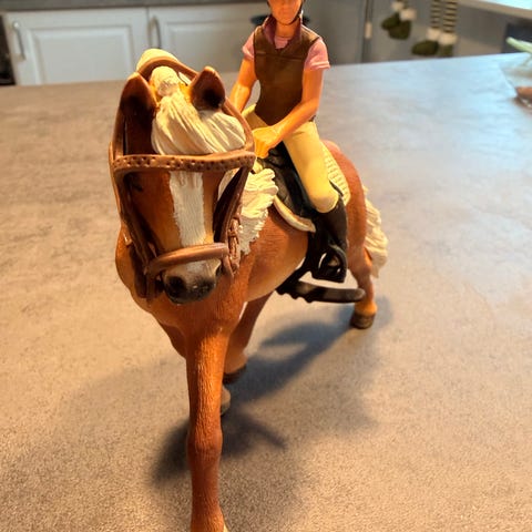 Schleich ridelegetøj bestående af en hest med sadel og en rytterfigur. Legetøjet er detaljeret designet og egnet til børn til leg og samling.