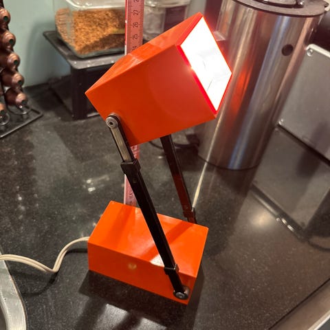 LamPetit, en fin klassisk vintage bord og væglampe fra 1960’erne. Lampen har 2 lysstyrker og kan placeres på væggen eller på bordet. Kan indstilles i mange positioner via teleskop stænger
