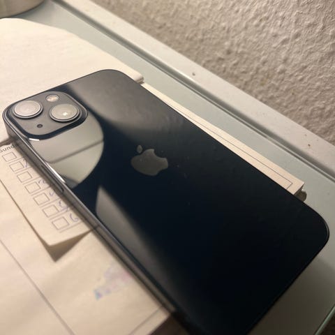 Apple iPhone 13 smartphone med 128 GB lagerplads i blå farve. Telefonen har et dobbelt kamera på bagsiden. Enheden har en metalramme med synlige brugsspor se billeder.