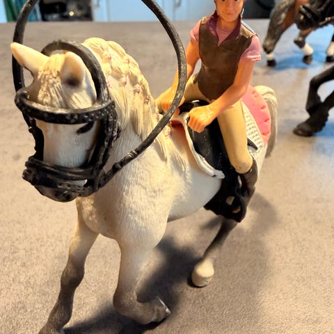 Schleich ridelegetøj med en rytter iført rideudstyr og en plaid med ternet mønster. Figuren er detaljeret og velegnet til børn, der interesserer sig for heste og ridning.